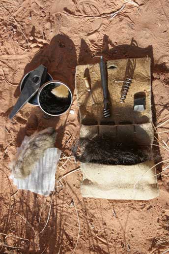 The typical contents of my bag is as follows: A handful of loose balls and patching at the bottom of the bag where I can easily reach in and find them rather than fiddling with another bag. The inner pocket of my shooting bag holds my hunting license (we still have to follow the law), vent pick made from a coyote toe bone, and some pre-cut patches for quick access. A flint wallet with spare flints, a forged worm, a wire worm, and buffalo hair for cleaning. A "chispa" fire steel which also doubles as a turnscrew and flint knapper, and a small tin of charred cloth with a flint for emergency fire starting. I also carry some extra cloth patches for cleaning or patching material. I keep a lucky rabbit foot from my first "Aux Aliments du Pays" camp for use as a pan brush. If I am shooting my smoothbore, I will also keep a small braintan bag of wadding material, and another braintan pouch of loose lead shot.
