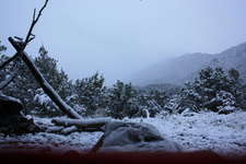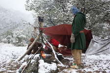 Present for this years turkey camp were Bill Gantic, Steve Chin, Nathan Blanchard, and Tom Karnuta. It was held during the weekend of April 29 - May 1, 2011 in the same location as last year, along the Arkansas River near Texas Creek. After an uneventful river crossing via canoe and a good hour hike into the backcountry we were at camp. That evening we headed out for a turkey scout and turned up nothing but wind and clouds. We headed out at at predawn Saturday in two groups hoping to outsmart the birds. The weather was perfect but all we found were a few decent sheds, nary a gobbler could we call up. Saturday evening a lite snow started falling around 9:30pm, and we awoke Sunday to several inches of the white stuff.