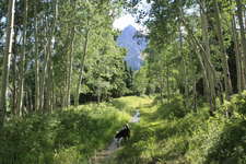 During August 12-13, 2011 a solo camp was done by Bill Gantic in the Snuffles Wilderness area of the San Juan mountains up the West Dallas Creek drainage. Bills dog Molly acompanied him. On the first day, 3 miles back into the Mears Peak basin at around 10,000 feet, camp was made. There was plenty of bear sign to be found; old logs ripped apart and rocks rolled looking for ants and grubs. The NW gun was loaded and Molly was on guard for the night. Fire starting skills were tested, though being late summer, dry tinder was very hard to come by. With only a small amount of char at hand it looked like to be a cold camp. The lock was removed from the NW gun and powder was used many times to make a fire near dark. It was the most enjoyed fire to be had. A tin with fishing kit was dumped out and a hole was made with knife to make more char. The next morning holes in mocs were mended and other gear repaired. Later camp was moved another 2 miles. On the trail dry tinder was added to the kit, thankfully, as evening rain came and a fire was started in no time. On the way a large bull elk was jumped at close quarters; meat could have been easily made back in the day.