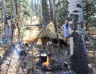 Oct 5-7, 2012 Hanratty's Hunting Camp in East Castle Rock gulch, southeast of Buena Vista, CO. Present were Bill Gantic and Mark Hanratty, with dogs Jessie, Cole and Molly. The fall mountain weather was beautiful. The nights were chilly with temps in the teens. We spent most of our time hunting and saw several rabbits. Gabe got one and a pine squirrel. Back in camp we worked on sign, and talked fur trade. Good vittles with no waste as the camp's dogs cleaned it up, Molly ate our chunk of cheese too.